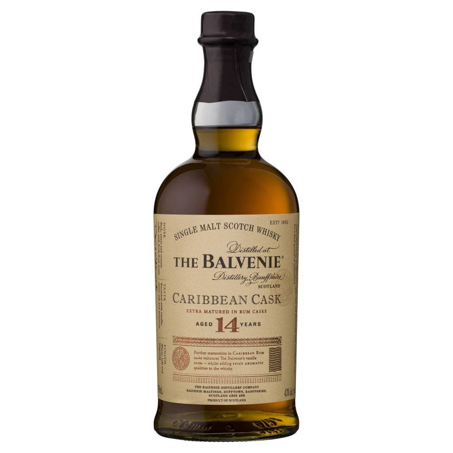 Balvenie Caribbean Cask was created by The Balvenie Malt Master, David Stewart, who celebrated an incredible 50th anniversary at the distillery in 2012. 14 years maturation in traditional oak casks & finished in Caribbean rum casks. TASTING NOTES: Rounded with vanilla, toffee, nutmeg and sweet oak notes, with a fruity character that develops with time. SERVING SUGGESTION: Serve neat or with a couple of drops of water (to bring out the flavours).