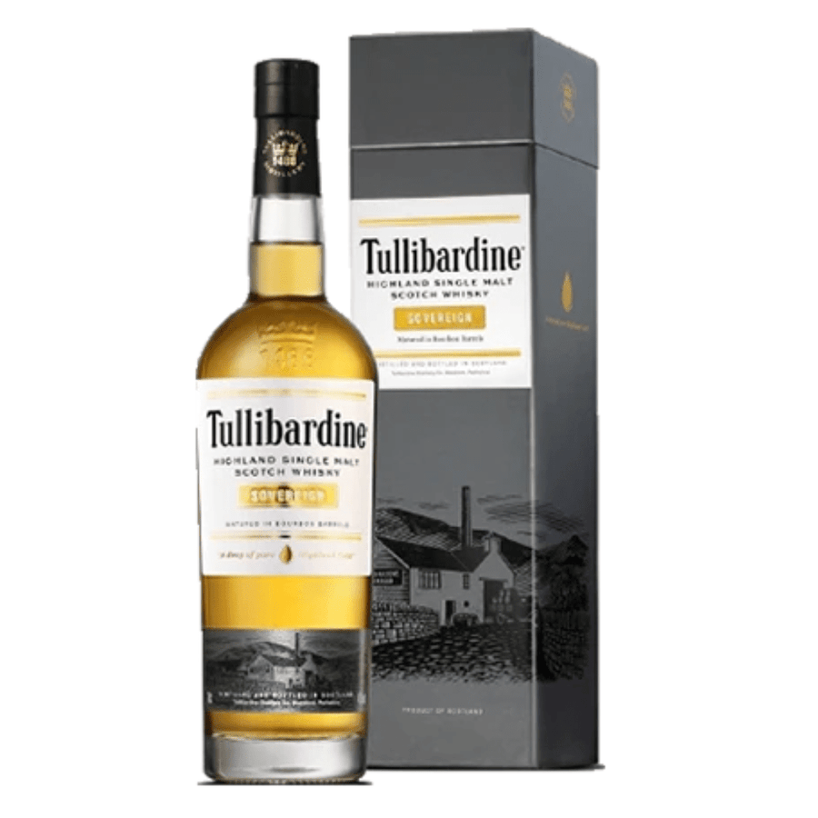 Tullibardine Sovereign - This delicious creamy single malt whisky was aged in first-fill bourbon barrels before bottling and adorned with golden detailing.